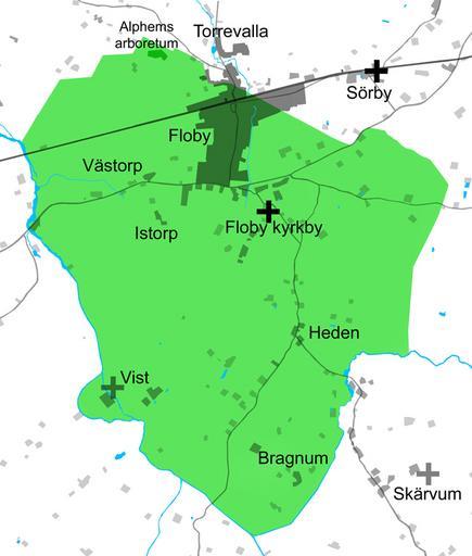 Keywords: Floby socken i Vilske härad.jpg en Map over Floby parish in Vilske hundred municipality of Falköping Västergötland Sweden Scale 1 40 000 The area of Floby parish is marked green The river Lidan and other watercourses are marked blue The curches of Floby and Sörby are marked with black crosses The church ruins of Vist and Skärvum are marked with grey crosses Railway roads populated areas villages and farms are marked with different shades of grey The botanical park Alphems arboretum is marked dark-green sv Karta över Floby socken i Vilske härad Falköpings kommun Västergötland Sverige Skala 1 40 000 Ytan för Floby socken markeras med grönt Sockengränserna är tagna från Registerkartan från 1990-talet Ån Lidan och andra vattendrag är markerade med blått Floby kyrka och Sörby kyrka är markerade med svarta kors Vists och Skärvums kyrkoruiner är markerade med grå kors Järnväg vägar tätbebyggelse byar och gårdar är markerade med gråtoner Den stora mörkgrå ytan i övre delen av bilden är Floby samhälle Parkanläggningen Alphems arboretum är markerad med mörkgrönt Inom Floby socken är Floby samhälle Floby kyrkby Alphems arboretum Västorp Istorp Vist Heden och Bragnum namngivna I grannsocknen Sörby är Torrevalla och Sörby kyrkby namngivna I grannsocknen Grolanda är byn Skärvum namngiven own Gunnar Creutz Achird 2010-06-26 Maps of civil parishes of Västergötland Maps by User Achird Floby socken Maps of Falköping Municipality Public domain files by Gunnar Creutz