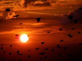 Keywords: flock birds birds flying sky cloud sunset east sun