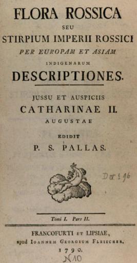 | Keywords: FLORA ROSSICA seu Stirpium Imperii Rossici per Europam et Asiam - 1790.jpg en Cover page book «Flora rossica» ru Титульный лист книги «Flora rossica» http //www narodnz co nz/elessar/2007/07/05/flora-rossica-seu-stirpium-imperii-rossici-per-europam-et-asiam-1790/ Peter Simon Pallas 1790 PD-old-100 Peter Simon Pallas |