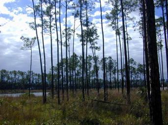 | Keywords: Florida pinelands usgov image.jpg Location from source page southern Florida and appearance identifies these pines as Pinus elliottii var densa From http //sofia usgs gov/virtual_tour/kids/ecosys html Pinelands or pine flatwoods are the most common plant communities in Florida Pinelands are found on nearly level land or on porous limestone Longleaf pine and slash pines are the dominant trees in pinelands Understory plants commonly include saw palmettos wildflowers and ferns Plants that grow in the pinelands must be resistant to fire because pinelands are maintained by fire Fires are beneficial to the pines because young pine seedlings require lots of sunlight to survive and the fires destroy hardwood competitors When fires occur hardwood seedlings and other understory plants are affected but the thick bark of the pine resists fire damage Without fires hardwoods would eventually overshadow the pines and a hardwood hammock would emerge Wildlife commonly found in pinelands includes deer squirrels bobcats skunks opossums raccoons birds snakes and tortoises PD-USGov Pinus elliottii Ecology of Florida Forests in Florida |