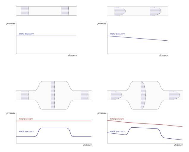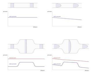 Keywords: Flow in pipes of changing section, static and total pressure, with and without friction losses.svg en Pressure distribution in a fluid along a pipe for various cross-sections On the left the flow is entirely without losses due to shear a purely hypothetical case and on the right the flow is laminar but viscous and features a loss in total pressure 2015-02 own Olivier Cleynen other versions cc-zero SVG physics Uploaded with UploadWizard Fluid flow in pipes |