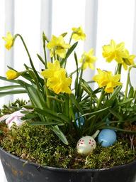 Keywords: flower arrangements pot eggs easter easter lilies green colors yellow wall outdoor