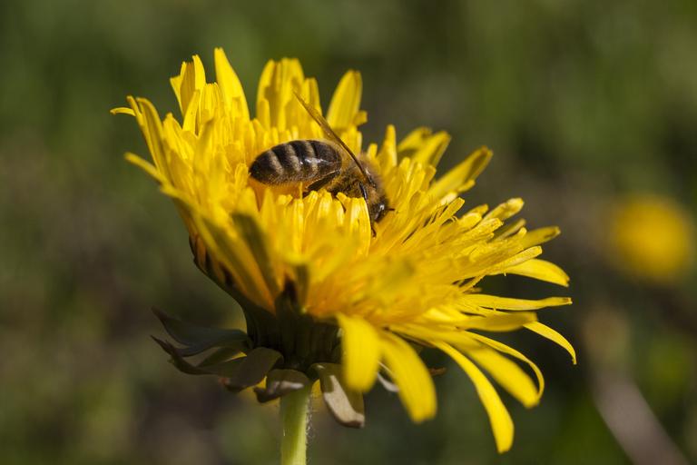 Keywords: flower bee pollen blossom bloom yellow flower dandelion honey bee nature close petals spring bloom plant yellow botany
