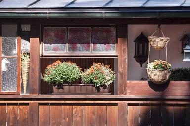 Keywords: flower boxes balcony window sill balcony plant flowers wood paneling glass window