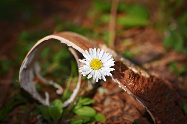 Keywords: flower daisy blossom bloom white pointed flower tree bark natural flooring nature close