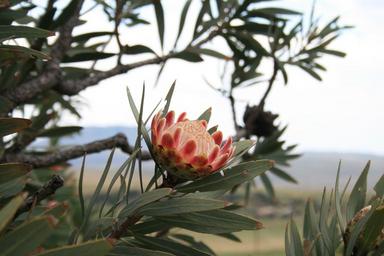 Keywords: flower flora plant indigenous protea dark pink cup shaped beautiful protea bush branches leaves fynbos a national flower area bound cape king protea