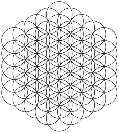 | Keywords: Flower-of-Life-61circles.svg A form of the Flower of Life hexagonal pattern where the center of each circle is on the circumference of six surrounding circles of the same diameter made up of 61 complete circles making clear the way in which the pattern is constructed Since only complete circles are used the full pattern is only visible towards the center of the diagram To see the most common form of the flower of life pattern using partial circular arcs so that the full pattern appears throughout view Image Flower-of-Life-19circles36arcs-enclosed png For a large carpet of the flower of life pattern go to Image Flower-of-Life-91circles36arcs png Flower-of-Life-61circles png 2009-12-26 15 54 UTC Flower-of-Life-61circles png AnonMoos derivative work McSush <span class signature-talk >talk</span> png -> svg redrawn McSush Flower-of-Life-61circles png Flower of Life geometry SVG geometry 6-fold rotational and reflectional symmetry |