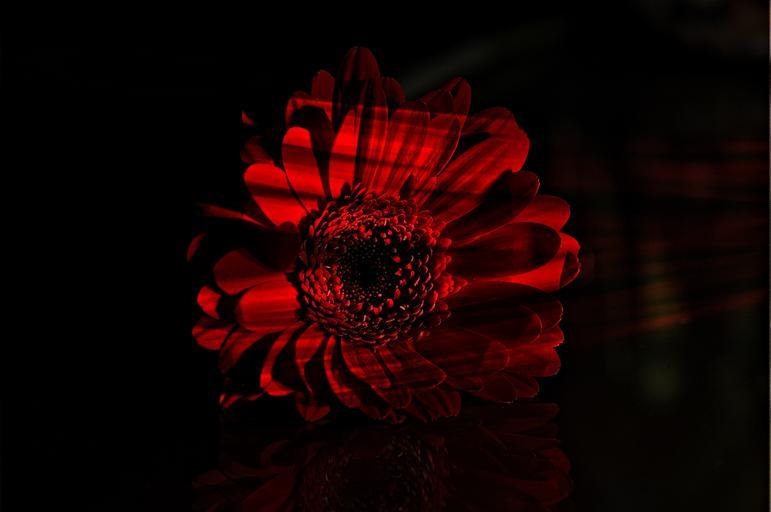 Keywords: flower red gerbera blossom bloom plant schnittblume light and shadow close lichtspiel sunlight dark