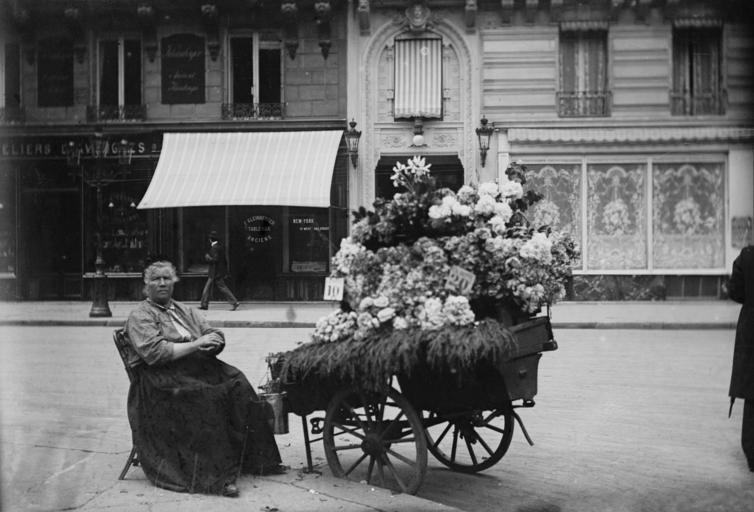 | Keywords: Flower seller, Paris.jpg Artwork Bain News Service en Flower seller Paris 1 negative glass 5 x 7 in or smaller Institution LoC object history exhibition history credit line <small> fr Au premier plan marchande de fleurs est assise sur une chaise au bord d'un trottoir près de sa voiture à bras chargée stationnée sur le coté de la chaussée La rue est déserte à l'exception d'un piéton en habit sombre vue de dos debout au premier plan dont la silhouette est coupée par le bord droit de la photo seuls le bras et la jambe gauches étant partiellement visibles Sur le trottoir d'en face près d'un lampadaire candélabre un piéton se dirige à grand pas vers la gauche en tournant la tête vers une vitrine Il longe des immeubles de type haussmannien La porte cochère chargée d'ornements en relief est flanquée de lanternes et surmontée d'une ouverture rectangulaire qui s'inscrit dans un arc en berceau plaqué sur la façade ouverture masquée par un store baissé en tissu rayé L'une des vitrines qui courent sur toute la largeur est munie d'un auvent en toile rayée et porte sur la vitre les inscriptions F KLEINBERGER / TABLEAUX / ANCIENS et NEW-YORK / 12 WEST 40TH STREET qui permettent de situer l'emplacement de la prise de vue La galerie d'art Kleinberger fondée en 1848 dirigée par Franz dit Francis Kleinberger jusque vers les années 1930 puis par son petit fils était installée au numéro 9 rue de l'Échelle Ier arrondissement Paris France pour Kleinberger voir Arts Magazine Vol 7 1932 Art Digest incorporated p 7 </small> accession number LOC-image ggbain 08598 PD-100 Flower shops in Paris Flower vendors in Paris Women at work in Paris Hand carts in Paris Historical images of street vendors in Paris Retail vehicles in Paris Sitting women Awnings Art galleries in Paris Kleinberger Rue de l'Échelle Paris Images of Paris from the Library of Congress |