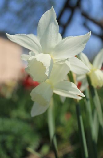 Keywords: flower white daffodil spring bloom blooming garden nature blossom plant green botany gardening flora petal summer season color outdoor colorful natural botanical park seasonal soft
