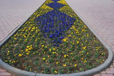 Keywords: flower yellow bed blue plants garden divider road gardening