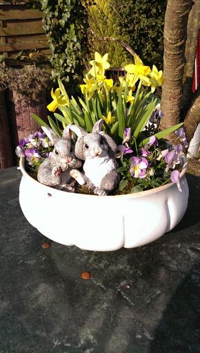 Keywords: flowerpot daffodils yellow rabbit easter decoration purple plant easter bunny