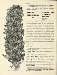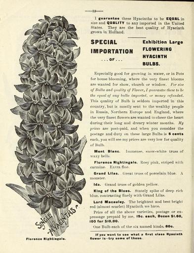 | Keywords: Flowers (15828017094).jpg  I guarantee these Hyacinths to be EQUAL in <br> size and QUALITY to any imported in the United <br> States They are the best quality of Hyacinth <br> grown in Holland <br> SPECIAL <br> IMPORTATION <br> OF <br> Exhibition Large <br> FLOWERING <br> HYACINTH <br> BULBS <br> Especially good for growing in water or in Pots <br> for house blooming where the very finest blooms <br> are wanted for show church or window For size <br> of Bulbs and quality of Flovjer I guarantee these to be <br> the equal of any bulbs imported or money refunded <br> This quality of Bulb is seldom imported in this <br> country but is mostly sent to the wealthy people <br> in Kussia Northern Europe and England where <br> the very finest flowers are wanted to cheer the heart <br> during their long and dreary winter months My <br> prices are post-paid and when you consider the <br> postage and duty on these large Bulbs is 5 cents <br> each you will see my prices are very low for quality <br> of Bulb <br> Mont Blanc Immense snow-white truss of <br> waxy bells <br> Florence Nightingale Kosy pink striped with <br> carmine Extra fine <br> Grand Lilas Great truss of porcelain blue A <br> monster <br> Ida Grand truss of golden yellow <br> King of the Blues Stately spike of deep rich <br> blue contrasting finely with Grand Lilas <br> Lord Macauley The brightest and best bright <br> red almost scarlet Hyacinth we have <br> Price of all the above varieties postage or ex- <br> pressage prepaid by me 15c each Dozen 1 60 <br> 100 for 10 00 <br> One Bulb each of the six named kinds 80c <br> If you want to see what a first class Hyacinth <br> flower is ” try some of these 43800617 148987 77812 Page 12 Text http //www biodiversitylibrary org/page/43800617 1900 Henry G Gilbert Nursery and Seed Trade Catalog Collection ; Miss Mary E Martin Firm ; Miss Mary E Martin Firm Biodiversity Heritage Library Flowers Christmas Easter midwinter and spring Garden Stories Catalogs Flowers Miss Mary E Martin Firm Nurseries Horticulture Seeds U S Department of Agriculture National Agricultural Library bhl page 43800617 dc identifier http //biodiversitylibrary org/page/43800617 bhlGardenStories Bulbs Plants Hyacinths Florence Nightengale BHLinbloom miss mary e martin firm nurseries horticulture u s department of agriculture national agricultural library bhlgardenstories bulbs plants florence nightengale bhlinbloom Information field Flickr posted date ISOdate 2015-02-05 CC-BY-2 0 BioDivLibrary https //flickr com/photos/61021753 N02/15828017094 2015-08-25 00 54 07 cc-by-2 0 PD-old-70-1923 Miss Mary E Martin Firm seed catalog Photos uploaded from Flickr by Fæ using a script |