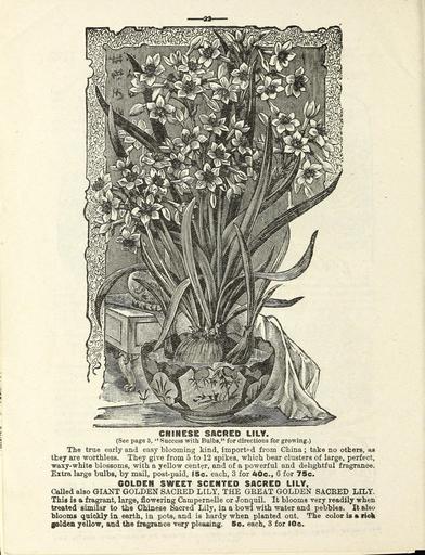 Keywords: Flowers (16448800181).jpg CHINESE SACRED LILY <br> See page 3 Success with Bulbs for directions for growing <br> The true early and easy blooming kind imported from China ; take no others as <br> they are worthless They give from 5 to 12 spikes which bear clusters of large perfect <br> waxy-white blossoms with a yellow center and of a powerful and delightful fragranoe <br> Extra large bulbs by mail post-paid 5c each 3 for 40c 6 for 75c <br> GOLDEN SWEET SCENTED SACRED LILY <br> Called also GIANT GOLDEN SACRED LILY THE GREAT GOLDEN SACRED LILY <br> This is a fragrant large flowering Campernelle or Jonquil It blooms very readily when <br> treated similar to the Chinese Sacred Lily in a bowl with water and pebbles It also <br> blooms quickly in earth in pots and is hardy when planted out The color is a fiolt <br> golden yellow and the fragrance very pleasing 5© each 3 for l©e 43800629 148987 77812 Text http //www biodiversitylibrary org/page/43800629 1900 Henry G Gilbert Nursery and Seed Trade Catalog Collection ; Miss Mary E Martin Firm ; Miss Mary E Martin Firm Biodiversity Heritage Library Flowers Christmas Easter midwinter and spring Garden Stories Catalogs Flowers Miss Mary E Martin Firm Nurseries Horticulture Seeds U S Department of Agriculture National Agricultural Library bhl page 43800629 dc identifier http //biodiversitylibrary org/page/43800629 bhlGardenStories Chinese sacred lily BHLinbloom miss mary e martin firm nurseries horticulture u s department of agriculture national agricultural library bhlgardenstories bhlinbloom Information field Flickr posted date ISOdate 2015-02-05 CC-BY-2 0 BioDivLibrary https //flickr com/photos/61021753 N02/16448800181 2015-08-25 00 53 35 cc-by-2 0 PD-old-70-1923 Miss Mary E Martin Firm seed catalog Photos uploaded from Flickr by Fæ using a script |
