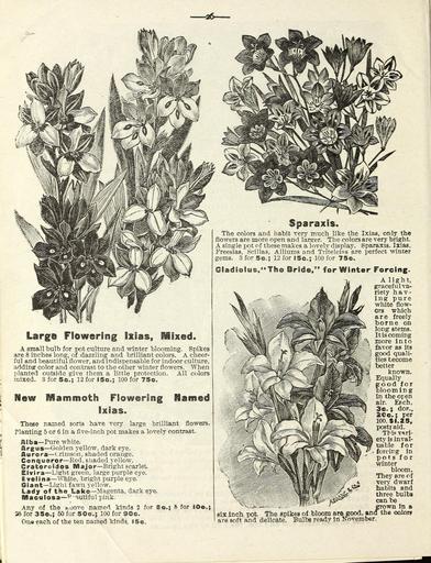 | Keywords: Flowers (16448807901).jpg Large Flowering Ixias mixed <br> A small bulb for pot culture and winter blooming Spikes <br> are 8 inches long of dazzling and brilliant colors A cheer- <br> ful and beautiful flower and indispensable for indoor culture <br> adding color and contrast to the other winter flowers When <br> planted outside give them a little protection All colors <br> mixed 3 for 5c; 12 for 15c; 100 for 75c <br> ew iUlammoth Flowering Named <br> Ixias <br> These named sorts have very large brilliant flowers <br> Planting 5 or 6 in a five-inch pot makes a lovely contrast <br> Alba Pure white <br> Argus Golden yellow dark eye <br> Aurora Crimson shaded orange <br> Conqueror Red shaded yellow <br> Cratercidos Major Bright scarlet <br> Elvira Light green large purple eye <br> Evelina White bright purple eye <br> Giant Light fawn yellow <br> Lady of the Lake Magenta dark eye <br> M a c u I o s a P autiful pink <br> Any of the toove named kinds 2 for So ; 5 for 10© 5 <br> 35 for 35e ; 50 for 50c; 100 for 90c <br> One each of the ten named kinds I So <br> Sparaxis <br> The colors and habit very much like the Ixias only the <br> flowers are more open and larger Th e colors are very bright <br> A single pot of these makes a lovely display Sparaxis Ixias <br> Freesias Scillas Alliums and Triteleias are perfect winter <br> gems 3 for 5c; 12 for S5c; 100 for 75c <br> Gladiolus Th© Bride for Winter Forcing <br> six inch pot The spikes of bloom are good and the color <br> are soft and delicate Bulbs ready in November 43800633 148987 77812 Text http //www biodiversitylibrary org/page/43800633 1900 Henry G Gilbert Nursery and Seed Trade Catalog Collection ; Miss Mary E Martin Firm ; Miss Mary E Martin Firm Biodiversity Heritage Library Flowers Christmas Easter midwinter and spring Garden Stories Catalogs Flowers Miss Mary E Martin Firm Nurseries Horticulture Seeds U S Department of Agriculture National Agricultural Library bhl page 43800633 dc identifier http //biodiversitylibrary org/page/43800633 bhlGardenStories Ixias Sparaxis Gladiolus BHLinbloom miss mary e martin firm nurseries horticulture u s department of agriculture national agricultural library bhlgardenstories bhlinbloom Information field Flickr posted date ISOdate 2015-02-05 CC-BY-2 0 BioDivLibrary https //flickr com/photos/61021753 N02/16448807901 2015-08-25 00 55 40 cc-by-2 0 PD-old-70-1923 Miss Mary E Martin Firm seed catalog Photos uploaded from Flickr by Fæ using a script |