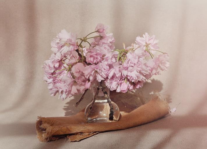 Keywords: flowers cherry blossoms flowering twig pink pink flowers vase glass deco decoration light and shadow close still life flowers photography