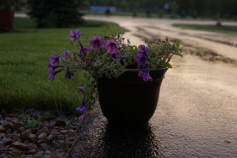 Keywords: flowers floral dusk evening home driveway petals plants rain