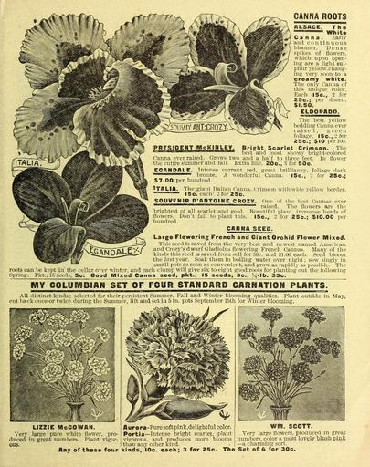 | Keywords: Flowers for springtime (16315380478).jpg CANNA ROOTS <br> AL SACE The <br> Whit <br> C a n n a Early <br> and continuous <br> bloomer Dense <br> spikes of flowers <br> which upon open- <br> ing are a light sul- <br> phur yellow chang- <br> ing very soon to a <br> creamy white <br> The only Canna of <br> this unique color <br> Each 15c 2 for <br> 25c; per dozen <br> 1 50 <br> ELDORADO <br> The best yellow <br> bedding Canna ever <br> raised green <br> foliage 15c 2 for <br> 25c; 10 per 100 <br> Bright Scarlet Crimson The <br> best and most showy bright-colored <br> Canna ever raised Grows two and a half to three feet In flower <br> the entire summer and fall Extra fine 20c 3 for 50c <br> EGANDALE Intense currant red great brilliancv foliage dark <br> bronze A wonderful Canna 15c 2 for 25c; <br> 7 00 per hundred <br> ITALIA The giant Italian Canna Crimson with wide yellow border <br> 13c each 2 for 25c <br> R D'ANTOINE CRQZV One of the best Cannas eTer <br> B ' ' ' ' i i ii raided The flowers are the <br> brightest of all scarlet and gold Beautiful plant immense heads of <br> flowers Don't fail to plant this 15c 2 for 25c; 10 00 per <br> hundred <br> CANNA SEEP <br> Large Flowering French and Giant Orchid Flower Mixed <br> This seed is saved from the very best and newest named American <br> and Crozy's dwarf Gladiolus flowering French Cannas Many of the <br> kinds this seed is saved from sell for 50c and 1 00 each Seed bloom <br> the first year Soak them in boiling water over night ; sow singly in <br> small pots as soon as convenient and grow as rapidly as possible The <br> roots can be kept in' the cellar over winter and each clump will give six to eight good roots for planting out the following <br> Spring Pkt 15 seeds 5c Good Mixed Canna seed pkt 15 seeds 3c -lb 35c <br> MY COLUMBIAN SET OF FOUR STANDARD CARNATION PLANTS <br> All distinct kinds ; selected for their persistent Summer Fall and Winter blooming qualities Plant outside in May <br> cut back once or twice during the Summer lift and set in 5 in pots September 15th for Winter blooming <br> LIZZIE McGOWAN <br> Very large pure white flower <br> duced in great numbers <br> ous <br> pro- <br> Plant vigor- <br> A u r o r a-Pure soft pink delightful color <br> Portia Intense bright scarlet plant <br> vigorous and produces more blooms <br> than any other kind <br> Any of these four kinds 10c each; 3 for 25c <br> WM SCOTT <br> Very large flowers produced in great <br> numbers color a most lovely blush pink <br> a charming sort <br> The Set of ft for 30c 43810159 149144 77948 Page 19 Text http //www biodiversitylibrary org/page/43810159 1900 Henry G Gilbert Nursery and Seed Trade Catalog Collection ; Miss Mary E Martin Firm ; Miss Mary E Martin Firm NameFound Canna seep NameFound Orchid NameFound Portia NameConfirmed Portia EOLID 114428 NameBankID 4307847 Biodiversity Heritage Library Flowers for springtime Garden Stories Catalogs Flowers Miss Mary E Martin Firm Nurseries Horticulture Seeds U S Department of Agriculture National Agricultural Library bhl page 43810159 dc identifier http //biodiversitylibrary org/page/43810159 bhlGardenStories Canna Carnation BHLinbloom miss mary e martin firm nurseries horticulture u s department of agriculture national agricultural library bhlgardenstories bhlinbloom Information field Flickr posted date ISOdate 2015-02-11 CC-BY-2 0 BioDivLibrary https //flickr com/photos/61021753 N02/16315380478 2015-08-24 23 58 10 cc-by-2 0 PD-old-70-1923 Canna genus Flowers for springtime Photos uploaded from Flickr by FĂŚ using a script |