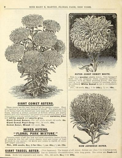 | Keywords: Flowers for springtime (16316819879).jpg MISS MARY E MARTIN FLORAL PARK NEW YORK <br> GIANT COMET ASTERS <br> These Asters are the very finest of all for garden culture They <br> are vigorous in growth arid profuse in bloom The plants grow 15 <br> to 18 inches high the flowers are very large and produced on long <br> stems making a perfect pyramid o f flowers ” which are highly <br> artistic and very beautiful ; the petals are curTed and twisted ; and <br> are as graceful as an ostrich feather Colors are carmine blue <br> and white peach and pearly grey <br> Giant Comet Asters ” Pkt all kinds mixed 100 seeds 6c <br> Giant Comet Pearl-Grey ” Pkt 50 seeds IOc <br> Comet Aster Mixed ” 100 seeds 5c <br> MIXED ASTERS <br> FLORAL PARK MIXTURE <br> Contains some of all the best and most expensive named kinds <br> of Asters in this list ” all colors shapes sizes and forms at least <br> 40 kinds in one packet ; 100 kinds and colors in eighth of ounce <br> and larger quantities <br> Pkt 200 seeds 5c; 3 for 12c; \ oz fOc; V oz 15c <br> ASTER-GIANT COMET WHITE <br> This is a wonder among Asters Very large»and <br> fluffy like an immense white Japanese Chrysan- <br> themum ; it is an ideal wedding flower The true <br> seed is very expensive ; beware of spurious stock ; <br> the ordinary White Comet is not a circumstance <br> to this <br> Pkt 100 seeds 8c 3 for 20c H ° 7 -- '5c <br> NEW JAPANESE ASTER <br> GIANT TASSEL ASTER ew Japanese The largest of all Asters ; flowers are often 5 to 6 inches across <br> like an immense Chrysanthemum with long petals The colors are flesh and <br> rose Seeds very expensive and scarce Pkt 100 seeds 8c; 3 for 20c 43810140 149144 77948 Page 2 Text http //www biodiversitylibrary org/page/43810140 1900 Henry G Gilbert Nursery and Seed Trade Catalog Collection ; Miss Mary E Martin Firm ; Miss Mary E Martin Firm NameFound Chrysanthemum NameConfirmed Chrysanthemum EOLID 38388 NameBankID 2657422 Biodiversity Heritage Library Flowers for springtime Garden Stories Catalogs Flowers Miss Mary E Martin Firm Nurseries Horticulture Seeds U S Department of Agriculture National Agricultural Library bhl page 43810140 dc identifier http //biodiversitylibrary org/page/43810140 Aster bhlGardenStories BHLinbloom miss mary e martin firm nurseries horticulture u s department of agriculture national agricultural library bhlgardenstories bhlinbloom Information field Flickr posted date ISOdate 2015-02-11 CC-BY-2 0 BioDivLibrary https //flickr com/photos/61021753 N02/16316819879 2015-08-24 23 54 13 cc-by-2 0 PD-old-70-1923 Aster Flowers for springtime Photos uploaded from Flickr by Fæ using a script |