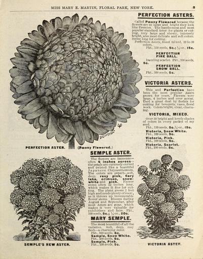 | Keywords: Flowers for springtime (16317176727).jpg MISS MARY E MARTIN FLORAL PARK NEW YORK <br> PERFECTION ASTERS <br> Called Psony Flowered because the <br> flowers are so large and bright they look <br> like Pseonies The handsomest and most <br> popular standard Aster for plants or cut- <br> ting very large and showy intensely <br> bright also most delicate and soft colors <br> Stems long for cutting <br> Perfection Asters finest mixed 20 to 30 <br> colors <br> Pkt 150 seeds 5c; -oz 15c <br> PERFECTION <br> FIRE BALL <br> Dazzling scarlet Pkt 100 seeds <br> 5c <br> PERFECTION <br> SNOW BALL <br> Pkt 100 seeds 5c <br> VICTORIA ASTERS <br> PERFECTION ASTER <br> SEMPLE'S NEW ASTER <br> Raeony Flowered <br> SEMPLE ASTER <br> The flowers are immense <br> often 4 inches across <br> the petals are curiously curved <br> and twisted like a beautiful <br> Japanese Chrysanthemum <br> The colors are superb soft <br> deep rosy pink fiery <br> lake crimson snow- <br> white and pink Flower <br> stems often 12 inches longr <br> which makes it fine for cut- <br> ting The plant grows 2 feet <br> high and needs plenty of room <br> as it throws up innumerable <br> flower stems Blooms during <br> August and September after <br> most Asters are gone which <br> makes it very valuable for <br> exhibitions and fairs Pkt <br> 100 seeds 5c; Y s -oz 20c <br> MARY SEMPLE <br> The most beautiful of all the <br> varieties Soft deep rosy <br> flesh a charming color <br> Pkt 100 seeds 6c <br> Semple Snow White <br> Pkt 100 seeds 5c <br> Semple Pink <br> ˘ Pkt 100 seeds 5c <br> This and Perfection have <br> been the most popular Asters <br> grown for years Flowers very <br> large 4 inches and over across <br> Used a great deal by florists for <br> cutting for bouquets vases floral <br> work Colors bright clear charm- <br> ing <br> VICTORIA MIXED <br> Over 30 bright and lovely shades <br> of colors in every packet of my <br> seed <br> Pkt 150 seeds 5c -oz f 15c <br> Victoria Snow White <br> Pkt 100 seeds 5c <br> Victoria Pink <br> Pkt 100 seeds 5c <br> Victoria Scarlet <br> Pkt 100 seeds 5c <br> VICTORIA ASTER 43810143 149144 77948 Page 3 Text http //www biodiversitylibrary org/page/43810143 1900 Henry G Gilbert Nursery and Seed Trade Catalog Collection ; Miss Mary E Martin Firm ; Miss Mary E Martin Firm NameFound Chrysanthemum NameConfirmed Chrysanthemum EOLID 38388 NameBankID 2657422 NameFound Victoria NameConfirmed Victoria EOLID 34123 NameBankID 897688 Biodiversity Heritage Library Flowers for springtime Garden Stories Catalogs Flowers Miss Mary E Martin Firm Nurseries Horticulture Seeds U S Department of Agriculture National Agricultural Library bhl page 43810143 dc identifier http //biodiversitylibrary org/page/43810143 bhlGardenStories Aster BHLinbloom miss mary e martin firm nurseries horticulture u s department of agriculture national agricultural library bhlgardenstories bhlinbloom Information field Flickr posted date ISOdate 2015-02-11 CC-BY-2 0 BioDivLibrary https //flickr com/photos/61021753 N02/16317176727 2015-08-24 23 54 14 cc-by-2 0 PD-old-70-1923 Aster Flowers for springtime Photos uploaded from Flickr by FĂŚ using a script |