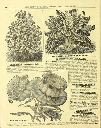 | Keywords: Flowers for springtime (16477127126).jpg MISS MARY £ MARTIN FLORAL PARK NEW YORK <br> CAM PANULA Canterbury Bell <br> Tki „¢utlful plant is full of flowers most of the <br> siinimei -Graceful Bells of delicate shades of color <br> Plants live and bloom year after year <br> Pkt 160 seeds of all varieties mixed 3c <br> VARIEGATED MAMMOTH CHILEAN BEET <br> ORNAMENTAL FOLlAOE_BJEETS <br> sub-tropical plants of taller growth <br> such as Cannas Ricinus etc they are <br> verv effective and nothing can exceed <br> a group of them for brilliancy and ef- <br> fect They are also equally as efieetn e <br> planted in the center of lower growing <br> plants As a background of center ot <br> a Begonia bed they are most beautiful <br> VARIEGATED MAMMOTH <br> CHILEAN BEET <br> Mammoth leaves of most beautiful <br> colors Pkt 50 seeds 5c <br> ORNAMENTAL BORECALE <br> \nother ornamented frost - proof <br> plant that retains its beauty until <br> Christmas Very showy and beauti- <br> ful Pkt 50 seeds 20 different kinds <br> 5 Calendula Oriole -Extra large <br> double and brilliant yellow Pkt 4c <br> Calendula Pot Marigold ” <br> Large and double ; rich golden yellow <br> i fl owers Pkt 3c <br> CUP-AND-SAUCER <br> CANTERBURY BELLS <br> Campanula Calycanthema <br> New and gigantic form of Campan- <br> ula producing large beautiful flow- <br> ers resembling a cup on a saucer <br> bwr-n»»-»»w W vj» - s s j ” w The cup flowers are often 3 to 4 incnes <br> fle e P an tne sauce 3 to 4 note 1 <br> for weeks during the summer The colors are mam e w mte suiptu <br> CUP-AMD-SAUCER 43810168 149144 77948 Page 28 Text http //www biodiversitylibrary org/page/43810168 1900 Henry G Gilbert Nursery and Seed Trade Catalog Collection ; Miss Mary E Martin Firm ; Miss Mary E Martin Firm Biodiversity Heritage Library Flowers for springtime Garden Stories Catalogs Flowers Miss Mary E Martin Firm Nurseries Horticulture Seeds U S Department of Agriculture National Agricultural Library bhl page 43810168 dc identifier http //biodiversitylibrary org/page/43810168 bhlGardenStories Ornamental Beets Cup and Saucer BHLinbloom miss mary e martin firm nurseries horticulture u s department of agriculture national agricultural library bhlgardenstories ornamental beets cup and saucer bhlinbloom Information field Flickr posted date ISOdate 2015-02-11 CC-BY-2 0 BioDivLibrary https //flickr com/photos/61021753 N02/16477127126 2015-08-24 23 51 53 cc-by-2 0 PD-old-70-1923 Flowers for springtime Photos uploaded from Flickr by Fæ using a script |