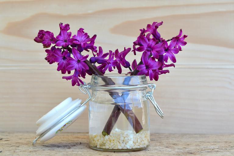 Keywords: flowers hyacinth purple jar decorative glass vase wood close fragrant flower