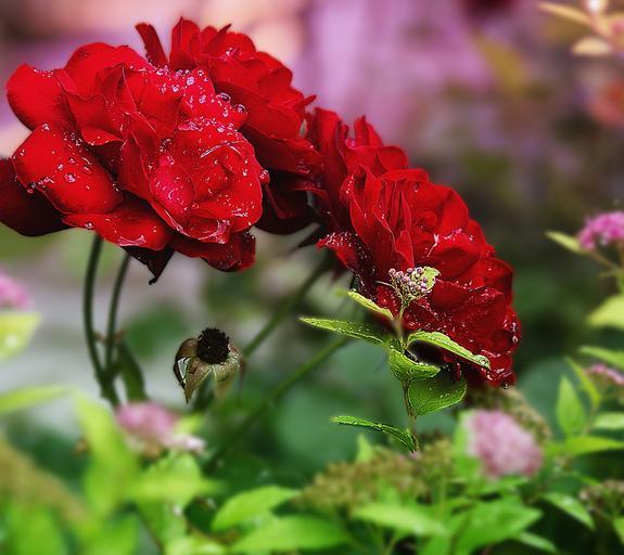 Keywords: flowers in the garden nature plants flowers beauty rose closeup red romanticism green blooms flourishing drops of water colored summer flower summer full bloom the delicacy delicacy the stem foliage violet the background purple