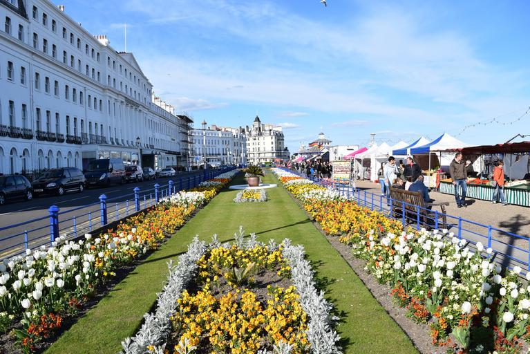 Keywords: flowers street buildings sunny sky and clouds eastbourne uk sussex