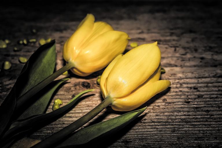 Keywords: flowers tulips cut flowers yellow plant yellow flower wood decoration close