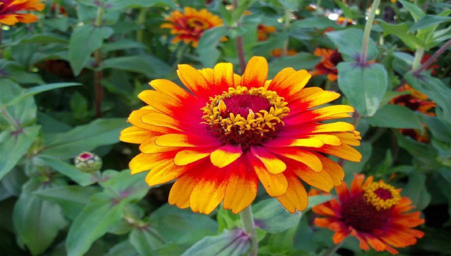 Keywords: flowers zinnia growing floral blossoms plants colorful petals blooming garden fresh red yellow orange