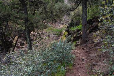 | Keywords: arizona coconino national forest coconinonationalforest flume trail flumetrail forest service forestservice fossil creek fossilcreek fossil springs fossilsprings fossil springs wilderness fossilspringswilderness national forest nationalforest red rock ranger district redrockrangerdistrict tonto national forest tontonationalforest backpacking canyon desert forest hiking outdoors spring springtime trail wilderness camp verde campverde united states unitedstates outdoor The wide trail suddenly turns into a narrow single-track, winding down into a drainage and back out to the wide two-track trail after a couple hundred feet. The Flume Trail starts at the old Irving Power Plant location and follows the line of the now-removed flume that carried the water from the dam to the power plants for generating electricity. The trail ends at the old Fossil Creek Dam, a four and a half mile trek one way. The trail ascends steadily about 500 feet from an elevation of 3769 foot at the trailhead over the first mile. For the next three and a half miles, the trail rolls gently several times in approximately 150 foot elevation changes before arriving at the dam. The trail is approximately 500 feet up the side of the canyon, offering fantastic views of the canyon and creek below. There is no creek access between the trailhead and the dam. The trail is very exposed and extremely hot in the warmer months. Hikers should carry at least four quarts of water. The trail is in the Fossil Creek Wilderness. Bikes and mechanized vehicles are prohibited. Camping is prohibited along Flume Trail, from the Fossil Creek Dam for several miles downstream (west) along the canyon. Flume Trail meets Fossil Springs Trail at the old dam. Continue another half mile through a narrow section of the canyon to find easy camping near the creek in the springs area. Camping is permitted during the fall-winter season 100 feet or more from the creek. A half mile from the dam is a marked side trail leading to the first spring source, where many hikers choose to refill their water bottles. Fossil Creek is one of two Wild and Scenic rivers in Arizona. A series of springs gush 20,000 gallons a minute year-round at the bottom of a 1,600 foot deep canyon, creating a lush riparian oasis rich with life. Over the years these calcium laden waters have laid down huge deposits of a type of limestone called travertine, creating deep pools for miles along the creek. The Wilderness and surrounding area are on the Tonto and Coconino National Forests, and are managed by the Coconino National Forest. During the spring-summer season, camping is prohibited anywhere in the Wilderness and surrounding area, and a reserved parking permit is required to park at the Flume trailhead at the Irving parking lot. See Flume Trail and Fossil Creek on the USFS Coconino National Forest website for maps, regulations, permit reservations, and other details. Photo by Deborah Lee Soltesz, March 11, 2016. Source: USFS Coconino National Forest. The wide trail suddenly turns into a narrow single-track, winding down into a drainage and back out to the wide two-track trail after a couple hundred feet. The Flume Trail starts at the old Irving Power Plant location and follows the line of the now-removed flume that carried the water from the dam to the power plants for generating electricity. The trail ends at the old Fossil Creek Dam, a four and a half mile trek one way. The trail ascends steadily about 500 feet from an elevation of 3769 foot at the trailhead over the first mile. For the next three and a half miles, the trail rolls gently several times in approximately 150 foot elevation changes before arriving at the dam. The trail is approximately 500 feet up the side of the canyon, offering fantastic views of the canyon and creek below. There is no creek access between the trailhead and the dam. The trail is very exposed and extremely hot in the warmer months. Hikers should carry at least four quarts of water. The trail is in the Fossil Creek Wilderness. Bikes and mechanized vehicles are prohibited. Camping is prohibited along Flume Trail, from the Fossil Creek Dam for several miles downstream (west) along the canyon. Flume Trail meets Fossil Springs Trail at the old dam. Continue another half mile through a narrow section of the canyon to find easy camping near the creek in the springs area. Camping is permitted during the fall-winter season 100 feet or more from the creek. A half mile from the dam is a marked side trail leading to the first spring source, where many hikers choose to refill their water bottles. Fossil Creek is one of two Wild and Scenic rivers in Arizona. A series of springs gush 20,000 gallons a minute year-round at the bottom of a 1,600 foot deep canyon, creating a lush riparian oasis rich with life. Over the years these calcium laden waters have laid down huge deposits of a type of limestone called travertine, creating deep pools for miles along the creek. The Wilderness and surrounding area are on the Tonto and Coconino National Forests, and are managed by the Coconino National Forest. During the spring-summer season, camping is prohibited anywhere in the Wilderness and surrounding area, and a reserved parking permit is required to park at the Flume trailhead at the Irving parking lot. See Flume Trail and Fossil Creek on the USFS Coconino National Forest website for maps, regulations, permit reservations, and other details. Photo by Deborah Lee Soltesz, March 11, 2016. Source: USFS Coconino National Forest. |