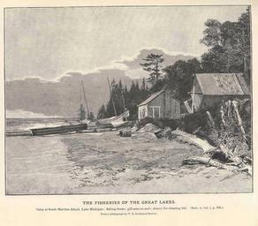 | Keywords: FMIB 35797 Fisheries of the Great Lakes.jpeg check categories 15 August 2015 3 Fisheries of the Great Lakes Camp at South Manitou Island Lake Michigan fishing boats; gill-nets on reel; shanty for cleaning fish Subject Fishing Fishing lodges South Manitou Island Lake Michigan Geographic Subject Michigan Lake Tag Sport Fishing 1887 Cite book Fisheries and Fishery Industries of the United States Section V History and Methods of the Fisheries v 2 Goode George Brown Washington DC Government Printing Office 1887 Plate 177 Creator George Brown Goode PD-UWASH-FMIB Institution University of Washington FMIB-source accession number 35797 Images from the Freshwater and Marine Image Bank to check The Fisheries and Fishery Industries of the United States South Manitou Island Recreational fishing |
