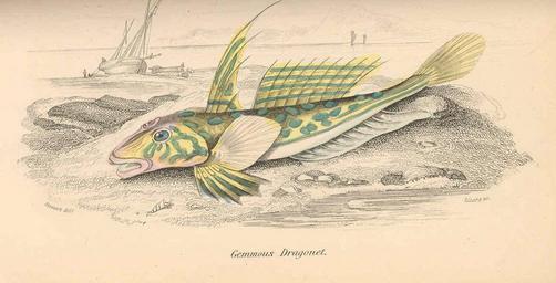 Keywords: FMIB 36392 Gemmous Dragonet.jpeg Gemmous Dragonet Subject Dragonets Tag Fish 1866 Cite book British Fishes Part I Hamilton Robert London England Chatto and Windus 1866 Naturalist's Library vol 36 Facing page 276 Creator Robert Hamilton PD-UWASH-FMIB Institution University of Washington FMIB-source accession number 36392 Images from the Freshwater and Marine Image Bank to check Robert Hamilton Callionymus lyra |