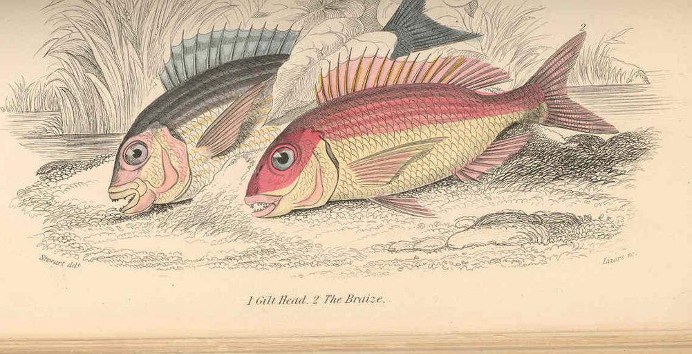 Keywords: FMIB 36403 Gilt Head (1); Braize (2).jpeg check categories 26 August 2015 2 Gilt Head 1 ; Braize 2 Subject Sparidae Pagrosomus Tag Fish 1866 Cite book British Fishes Part I Hamilton Robert London England Chatto and Windus 1866 Naturalist's Library vol 36 Facing page 172 Creator Robert Hamilton PD-UWASH-FMIB Institution University of Washington FMIB-source accession number 36403 Images from the Freshwater and Marine Image Bank to check Robert Hamilton Sparidae |