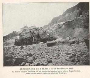 | Keywords: FMIB 36900 Eboulement de Falaise au Cap de la Heve, en 1905.jpeg check categories 12 September 2015 2 Eboulement de Falaise au Cap de la Heve en 1905 La Falaise de craie s'ecroula sur 200 metres de longeur et 50 metres de profondeur jetant 700 000 metres cubes de debris sur le rivage Subject La Heve France Coasts--France Geographic Subject France--La Heve Tag Coasts 1913 Cite book Mer la Mer Dans la Nature la Mer et l'Homme Clerc-Rampal G Paris France Librairie Larousse 1913 96 Creator Georges Clerc-Rampal PD-UWASH-FMIB Institution University of Washington FMIB-source accession number 36900 Images from the Freshwater and Marine Image Bank to check Georges Clerc-Rampal Coasts of France |