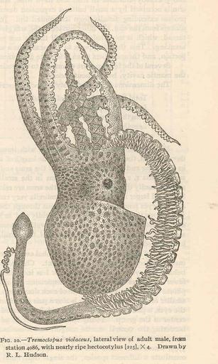 | Keywords: FMIB 39105 Tremoctopus violaceus, lateral view of adult male, from station 4086, with nearly ripe hectocotylus.jpeg Tremoctopus violaceus lateral view of adult male from station 4086 with nearly ripe hectocotylus Subject Cephalopoda Tremoctopus Tag Fish 1914 Cite book Cephalopoda of the Hawaiian Islands Bulletin of the United States Bureau of Fisheries vol 32 1912 Berry S Stillman Washington DC Government P rinting Office 1914 Fig 10 R L Hudson PD-UWASH-FMIB Institution University of Washington FMIB-source accession number 39105 Images from the Freshwater and Marine Image Bank to check R L Hudson Tremoctopus |