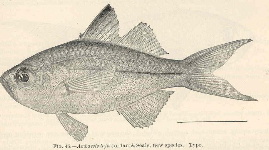 | Keywords: FMIB 39649 Ambassis lafa Jorda 7 Seale, new species Type.jpeg Ambassis lafa Jorda 7 Seale new species Type Subject Centropomidae Ambassis Tag Fish 1906 of the Species Found in the Archipelago with a Provisional Check-List of the Fishes of Oceania Jordan David Starr; Seale Alvin Washington DC Government Printing Office 1906 Bulletin of the Bureau of Fisheries v 25 1905 Fig 46 Creator David Starr Jordan Creator Alvin Seale PD-UWASH-FMIB Institution University of Washington FMIB-source accession number 39649 Images from the Freshwater and Marine Image Bank to check David Starr Jordan Alvin Seale Ambassis miops |