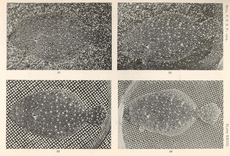 | Keywords: FMIB 40283 31- Paralichthys albiguttus (F), 14 cm long, in large, shallow granite pan (variegated, dark blue and white) Note the small.jpeg 31- Paralichthys albiguttus F 14 cm long in large shallow granite pan variegated dark blue and white Note the small white spots shown in irregular rows across the fish 32- Individual F on black and white background dots 2 mm in diameter The white spots in the irregular rows have become more conspicuous but the pattern is essentially the same although the spacial interrelationship of the light and dark areas in the background is very different 33- Individual C in granite pan 34- Individual C on black and white background 2 mm squares Note that the patterns produced by these two very different backgrounds are essentially the same Subject Gulf flounder--Adaptation Gulf flounder--Behavior Tag Fish 1916 Cite book Changes in Shade Color and Pattern in Fishes and their Bearing on the Problems of Adaptation and Behavior with Especial Reference to the Flounders Paralichthys and Ancylopsetts Bulletin of the United States Bureau of Fisheries vol 34 1914 Mast S O Washington DC Government Printing Office 1916 Plate XXVII S O Mast PD-UWASH-FMIB Institution University of Washington FMIB-source accession number 40283 Images from the Freshwater and Marine Image Bank to check S O Mast Paralichthys albigutta |