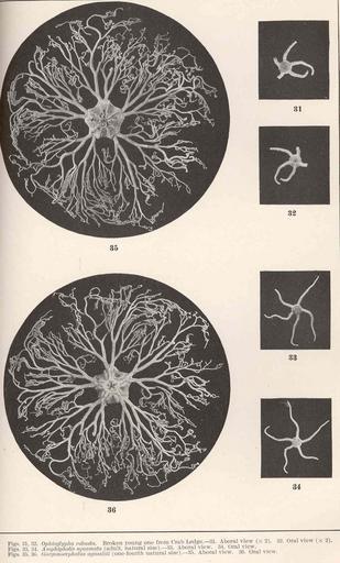 | Keywords: FMIB 41101 Ophioglypha robusta Broken young one from crab ledge, aboral view (31), oral view (32); Amphipholis squamata (adult), aboral.jpeg  check categories 17 August 2015 4 Ophioglypha robusta Broken young one from crab ledge aboral view 31 oral view 32 ; Amphipholis squamata adult aboral view 33 oral view 34 ; Gorgonocephalus agassizii aboral view 35 oral view 36 Subject Ophiuroidea Ophioglypha Amphipholis Gorgonocephalus Starfishes Tag Invertebrates 1904 Cite book Echinoderms of the Woods Hole Region Clark Hubert Lyman Washington DC Government Printing Office 1904 Bulletin of the United States Fish Commission vol 22 1902 Plate 6 Creator Hubert Lyman Clark PD-UWASH-FMIB Institution University of Washington FMIB-source accession number 41101 Images from the Freshwater and Marine Image Bank to check Hubert Lyman Clark Amphipholis Gorgonocephalus Asteroidea |