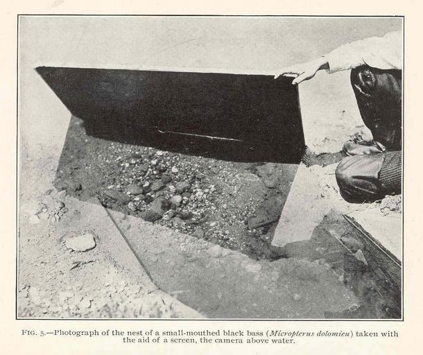 | Keywords: FMIB 42277 Photograph of the nest of a small-mouthed black bass (Micropterus dolomieu) taken witht he add of a screen, the camera above.jpeg  Photograph of the nest of a small-mouthed black bass Micropterus dolomieu taken witht he add of a screen the camera above water Subject Smallmouth bass--Nests Underwater photography--Equipment and supplies Tag Fish 1910 Cite book Methods of Studying the Habits of Fishes with an Account of the Breeding Habits of the Horned Dace Reighard Jacob Washington DC Government Printing Office 1910 Bulletin of the Bureau of Fisheries vol 28 1908 Part 2 Plate CXVI-5 Creator Jacob Ellsworth Reighard PD-UWASH-FMIB Institution University of Washington FMIB-source accession number 42277 Images from the Freshwater and Marine Image Bank to check Jacob Ellsworth Reighard Micropterus dolomieu |
