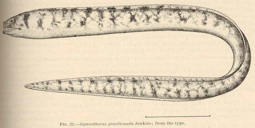 Keywords: FMIB 42384 Gymnopthorax gracilicauda Jenkins; from the type.jpeg Gymnopthorax gracilicauda Jenkins; from the type Subject Morays Gymnothorax Tag Fish 1905 Cite book Shore Fishes of the Hawaiian Islands With a General Account of the Fish Fauna Jordan David Starr; Evermann Barton Warren Washington DC Government Printing Office 1905 Bulletin of the United States Fish Commission vol 23 for 1903 part I Fig 23 Creator David Starr Jordan Creator Barton Warren Evermann PD-UWASH-FMIB Institution University of Washington FMIB-source accession number 42384 Images from the Freshwater and Marine Image Bank to check David Starr Jordan Barton Warren Evermann Gymnothorax gracilicauda |