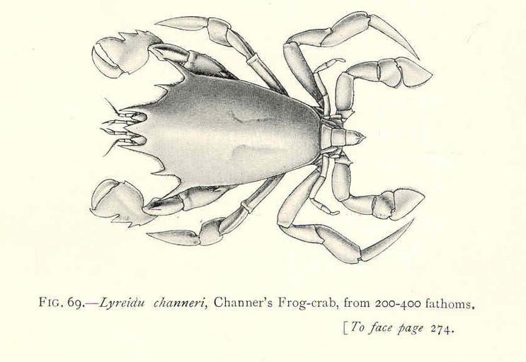| Keywords: FMIB 45482 Characteristic Deep-Sea Crustaceans.jpeg  check categories 23 August 2015 4 Characteristic Deep-Sea Crustaceans Lyreidu channeri Channer's Frog-crab from 200-400 fathoms Subject Crabs Lyreidu Tag Shellfish 1902 Cite book Naturalist in Indian Seas or Four Years with the Royal Indian Marine Survey Ship 'Investigator' Alcock Alfred W New York City NY E P Dutton Co 1902 Fig 69 Creator Alfred William Alcock PD-UWASH-FMIB Institution University of Washington FMIB-source accession number 45482 Images from the Freshwater and Marine Image Bank to check Alfred William Alcock Brachyura Lyreidus |