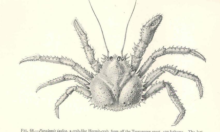 | Keywords: FMIB 45483 Deceptive Hermit-Crab of the Lithodes Group.jpeg check categories 23 August 2015 4 Deceptive Hermit-Crab of the Lithodes Group Paralomis indica a crab-like Hermit-crab from off the Travancore coast 430 fathoms The last pair of legs are much reduced in size and are folded out of sight Subject Hermit crabs Paralomis Tag Shellfish 1902 Cite book Naturalist in Indian Seas or Four Years with the Royal Indian Marine Survey Ship 'Investigator' Alcock Alfred W New York City NY E P Dutton Co 1902 Fig 68 Creator Alfred William Alcock PD-UWASH-FMIB Institution University of Washington FMIB-source accession number 45483 Images from the Freshwater and Marine Image Bank to check Alfred William Alcock Paguroidea Paralomis Brachyura |