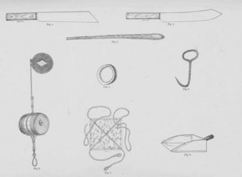 | Keywords: FMIB 45858 Fresh Halibut Fishery.jpeg check categories 18 August 2015 3 Fresh Halibut Fishery Fig 1 Bait-chopper; Fig 2 Bait-slivering knife; Fig 3 Halibut-killer and gob-stick; Fig 4 Woolen hand-nipper; Fig 5 Halibut-gaff; Fig 6 Trawl buoy and black ball; Fig 7 Canvas skate for trawl; Fig 8 Dory scoop Subject Halibut fisheries--Equipment and supplies Fisheries--Equipment and supplies Tag Fisheries Techniques 1887 Cite book Fisheries and Fishery Industries of the United States Goode George Brown Washington DC Government Printing Office 1887 Plate 5 Creator George Brown Goode PD-UWASH-FMIB Institution University of Washington FMIB-source accession number 45858 Images from the Freshwater and Marine Image Bank to check The Fisheries and Fishery Industries of the United States Fishing equipment Fisheries |