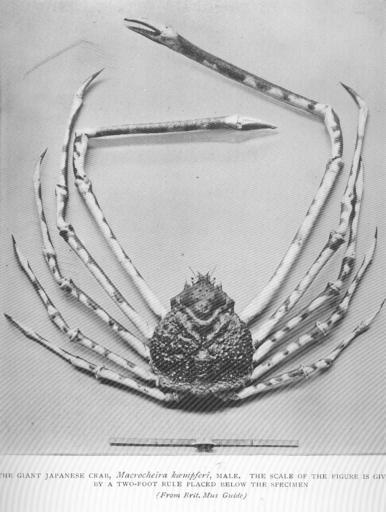 | Keywords: FMIB 46470 Giant Japanese Crab, Macrocheira kempferi, Male The scale of the figure is given by a two-foot rule placed below the specimen.jpeg  check categories 19 August 2015 4 Giant Japanese Crab Macrocheira kempferi Male The scale of the figure is given by a two-foot rule placed below the specimen Subject Crabs Macrocheira Tag Shellfish 1911 Cite book Life of Crustacea Calman W T New York the MacMillan Company 1911 Plate 11 Creator William Thomas Calman PD-UWASH-FMIB Institution University of Washington FMIB-source accession number 46470 Images from the Freshwater and Marine Image Bank to check William Thomas Calman Brachyura Macrocheira |
