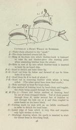 | Keywords: FMIB 47505 Cutting-In a Right Whale or Bowhead.jpeg check categories 21 August 2015 2 Cutting-In a Right Whale or Bowhead A-Fluke-chain adjusted to the small B-Fin-Chain fastened around left fin C-Ring of fin-chain into which blubber-hook is fastened to raise fin and blanket-piece the starting point when unwinding blubber from the whale D-Hole in root of lip into which blubber-hook is inserted to hoist lip on board ship F-G- Scarf to detach and hoist lower lip E-H- Scarf cut from fin below and forward of eye to blow-holes H on head E-I- Scarf from fin E to back of whale I J-K- Scarf cut in removing blubber while whale is being rolled The other spiral lines show final scarfs L-Hole mortised in head for head-chain M-One method of hoisting head by head-chain and toggles the chain being pasdsed through the blow-holes M M Fig 2 -Newer and better method of hoisting head by use of chain strapped blocks Tail of chain passed through from H under several feet of blubber to and through the hole cut at L and then coupled to sister-hooks on the lower block N-Cutting made by man with an ax while overboard in order to detach the head bone O-Lower edge of bone which is very thin and requires only light strokes to free it P-Markings showing where the spade is inserted to start the throat bone in detaching head Q-Where the hole is made in throat in order to haul it on board R-Throat-chain and toggle by wihich throat is sometimes taken on board S-Dotted line to show where backbone is cut to lessen strain on windlass when taking off lbubber T-Wide section of blanket-piece which is trimmed down by boarding-knife when taking blubber on board Subject Whaling--Equipment and supplies Tag Aquatic Mammals 1916 00 Cite book Real Story of the Whaler Whaling Past and Present Verrill A Hyatt Alpheus Hyatt New York City NY D Appleton and Company 1916 48 Creator Alpheus Hyatt Verrill PD-UWASH-FMIB Institution University of Washington FMIB-source accession number 47505 Images from the Freshwater and Marine Image Bank to check Alpheus Hyatt Verrill Marine mammals |