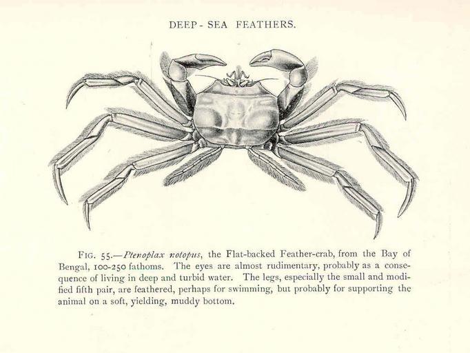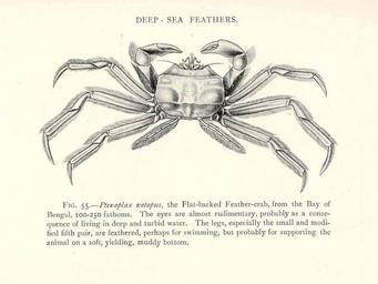 Keywords: FMIB 47673 Deep-Sea Feathers.jpeg check categories 21 August 2015 3 Deep-Sea Feathers Ptenoplax notopus the Flat-backed Feather-crab from the Bay of Bengal 100-250 fathoms The eyes are almost rudimentary probably as a consequence of living in deep and turbid water The legs especially the small and modified fifth pair are reathered perhaps for swimming but probably for supporting the animal on a soft yielding muddy bottom Subject Ptenoplax Crabs Tag Shellfish 1902 00 Cite book Naturalist in Indian Seas or Four Years with the Royal Indian Marine Survey Ship 'Investigator' Alcock Alfred W New York City NY E P Dutton Co 1902 Fig 55 Creator Alfred William Alcock PD-UWASH-FMIB Institution University of Washington FMIB-source accession number 47673 Images from the Freshwater and Marine Image Bank to check Alfred William Alcock Brachyura |