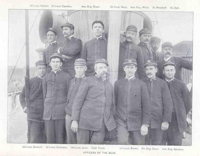 | Keywords: FMIB 47735 Officers of the Bear.jpeg Officers of the Bear 2d Lieut Hamlet 2d Lieut Camden Asst Eng Bryan 2d Lieut Berry Asst Eng Wood Dr Woodruff Dr Call 2d Lieut Bertholf 2d Lieut Cochrane 1st Lieut Jarvis Capt Tuttle 1st Lieut Brown Ch Eng Spear Asst Eng Spencer Subject Bear Ship Ships--United States--Officers Tag People 1899 00 Cite book Report of the Cruise of the U S Revenue Cutter Bear and the Overland Expedition for the Relief of the Whalers in the Arctic Ocean from November 27 1897 to September 13 1898 Washington DC Government Printing Office 1899 Facing page 11 author PD-UWASH-FMIB Institution University of Washington FMIB-source accession number 47735 Images from the Freshwater and Marine Image Bank to check |