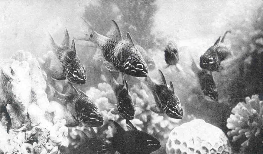 Keywords: FMIB 47743 Viewed from the side, as in an aquarium, fishes appear much more beautiful under water than when seen from above These are but a.jpeg check categories 19 September 2015 2 Viewed from the side as in an aquarium fishes appear much more beautiful under water than when seen from above These are but a few of thousands of Big-Eyes Apogon norfolcensis which foregather in coral pools at Lord Howe Island Though ordinarily regarded as pests these were studies with intense interest by fishermen who discovered in them unsuspected charms revealed by this unfamiliar aspect Subject Apogon Apogon norfolcensis Photography of fishes Tag Fish 1924 00 Cite book Fishes and the Movies Australian Museum Magazine v 2 1924 McCulloch Allan R Sydney Australia Australian Museum 1924 74 A R McCulloch PD-UWASH-FMIB Institution University of Washington FMIB-source accession number 47743 Images from the Freshwater and Marine Image Bank to check A R McCulloch Apogon norfolcensis |