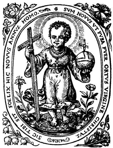 | Keywords: FoelixHicNovusAnnus.jpg The inscription is a Latin elegaic couplet sum novus ut pura puer ortus virgine Christus Sic tibi sit foelix hic novus annus homo I am as new as Christ child born of a virgin pure Mortal may your new year be just as happy and sure self-made scan from Paul Heitz Neujahrswunsche des XV Jahrhunderts Strassburg 1900 18 16th century woodcut Original in Prague Adalbert Ritter von Lanna Collection Kenmayer Christmas cards New Year cards 16th-century engravings Engravings of children Baby New Year |